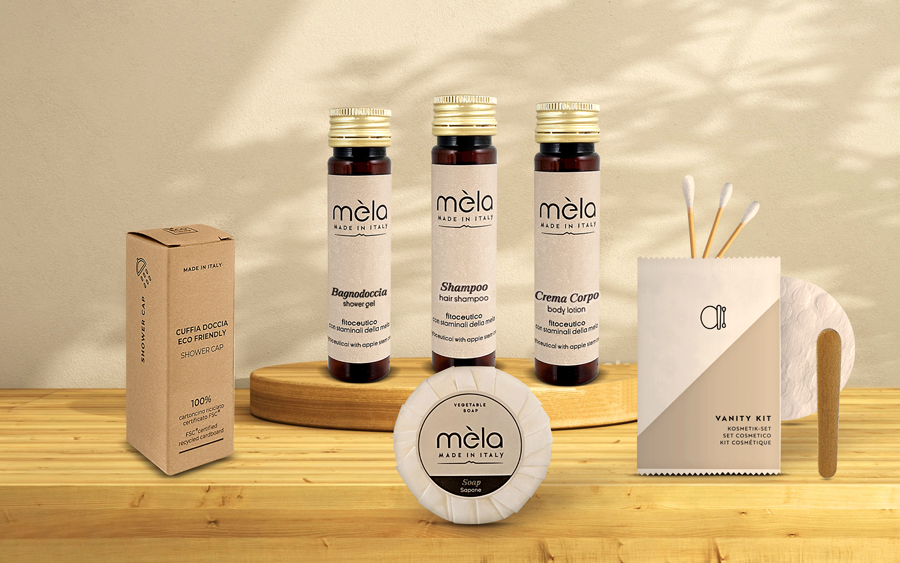 The Mela guest amenities (Italian for apple) include phytoceutical cosmetics with apple stem cells. It is an innovative formulation designed to revitalize the skin in a natural way thanks to the antioxidant effect of the Malus domestica active stem cells. These guest toiletries have a low environmental impact as well as a fresh perfume without allergens and are ideal even for the most delicate skin, because they are paraben-free.